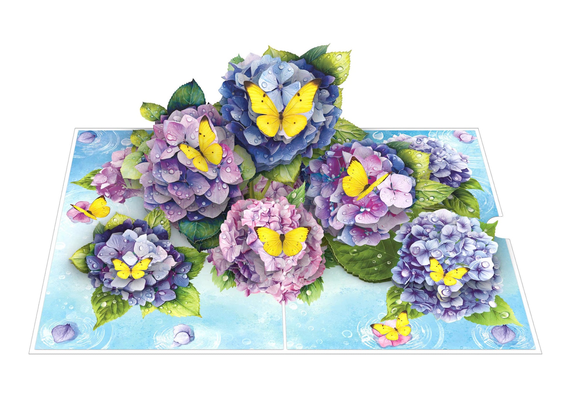 🌸 Magnificent Hydrangea Pop-Up: Unfold a luxurious 3D floral display featuring large, textured Blue and Purple Hydrangea clusters, accented by bright Yellow Butterflies - a stunning symbol of gratitude and heartfelt emotion.